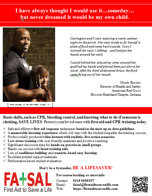For individual and face-to-face course booking at your office/residence or our office, please contact: faisal@firstaidtosavealife.com / 0092 345 5656307